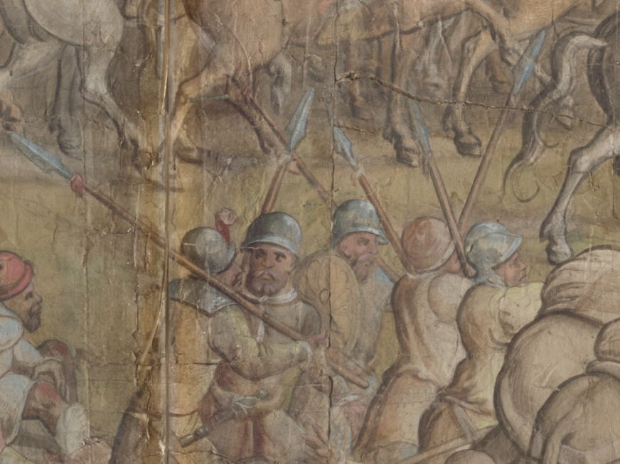 | En esta escena del mismo cartón, que recoge la marcha de un grupo de infantes armados con partesanas con los hierros empenachados, vemos que el artista parece haberse olvidado de pintar el hierro del soldado que lleva rodela, aunque el asta aparece de modo claro apoyada sobre su hombro diestro. Recordemos que los cartones fueron diseñados en "espejo", y hay que voltearlos en su eje vertical para obtener el dibujo final que quedaría hilado en los tapices. |